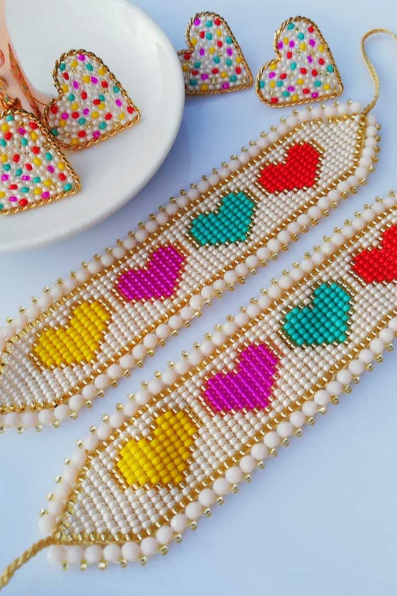 Pulsera ajustable ancha tejida artesanalmente con mostacillas en colores vivos.
