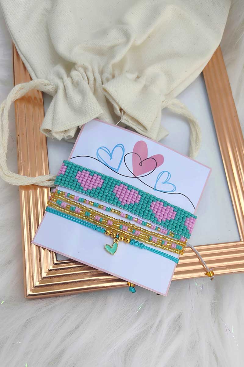 Set de pulseras de 7 tiras en colores rosa, menta y dorado, herrajes dorados en covergold, ajustables
